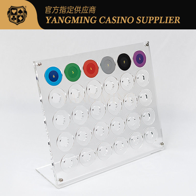 Całkowicie przejrzystystojak z akrylowych odłamków, trzyma 30 pokerażetonyo średnicy 40 mm, starannie rozmieszczone w 5 rzędach i 6 kolumnach, stosowane głównie do okrągłego wyświetlania chipów nastoły pokerowe w kasynieDostępne zapasy producenta, wsparcie wielkości hurtowej.