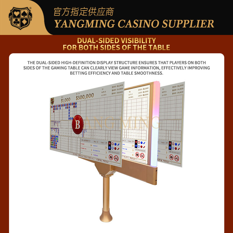Wyświetlacz kasynowyposiada jasne podświetlenie LED i smukły, nowoczesny design, zapewniający wyraźną widoczność z obu stronstołu. Zaprojektowany do ciągłej pracy w kasynie, zapewnia stabilną wydajność, żywą grafikę i szerokie kąty widzenia. Idealny do Baccarata i innych gier stołowych, obsługuje niestandardowe treści, wyświetlanie w wielu językach i branding logo, aby zwiększyć efektywność zarządzania grami i ogólną prezentację kasyna.